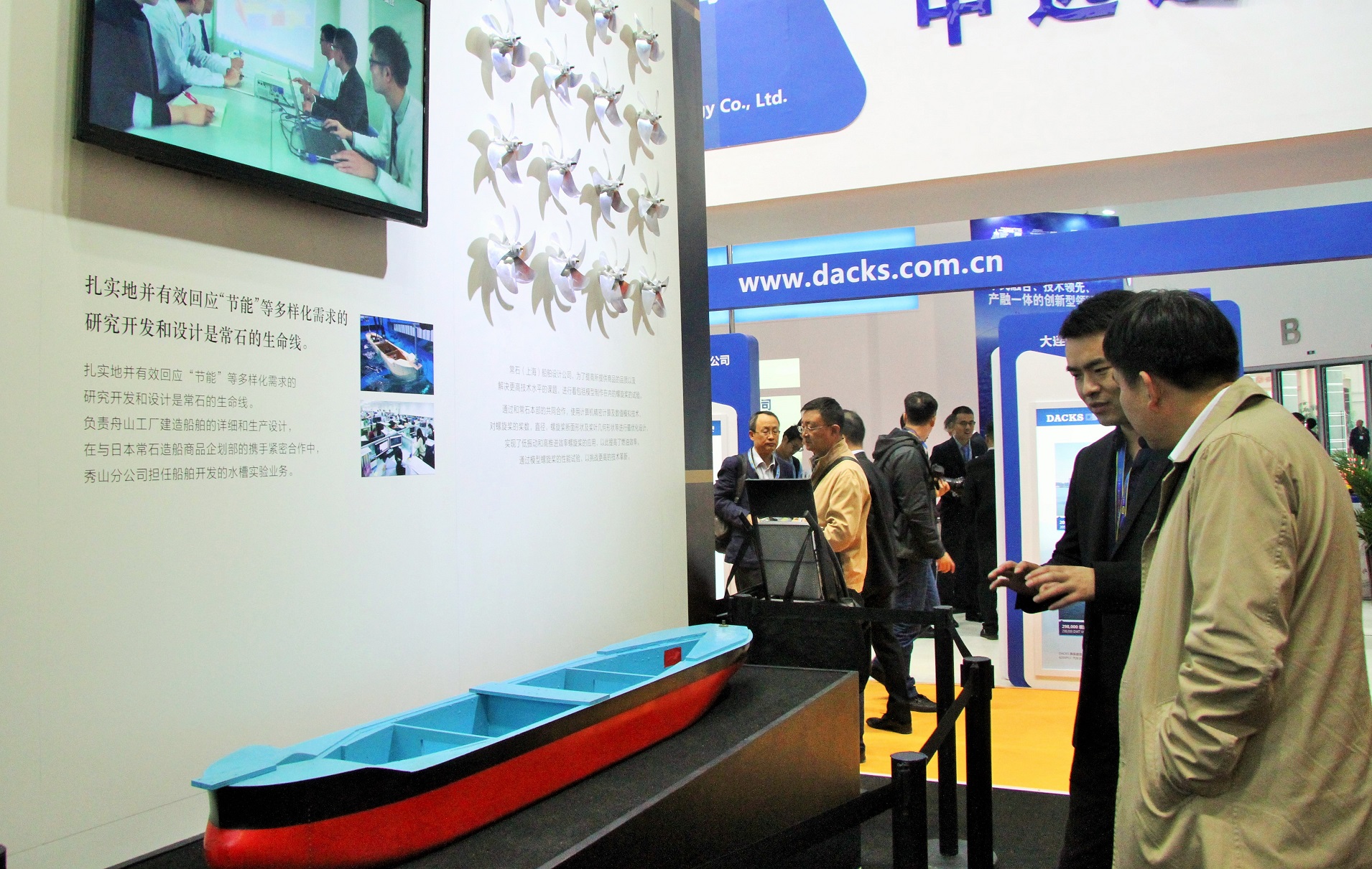 展會期間,常石舟山還在現(xiàn)場播放了新船型的宣傳視頻,介紹大型豪華郵輪的內(nèi)部構(gòu)想圖,并展示開發(fā)船型時用于水槽試驗的木船模型和16種螺旋槳模型。此外,現(xiàn)場還舉辦主題演講,介紹了常石舟山與地區(qū)的合作經(jīng)營發(fā)展現(xiàn)狀和對未來的展望。